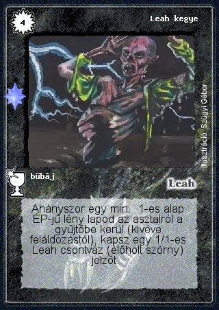 Szöveg: Ahányszor egy min. 1-es alap ÉP-jű lény lapod az asztalról a gyűjtőbe kerül (kivéve feláldozástól), kapsz egy 1/1-es Leah csontváz (élőholt szörny) jelzőt.