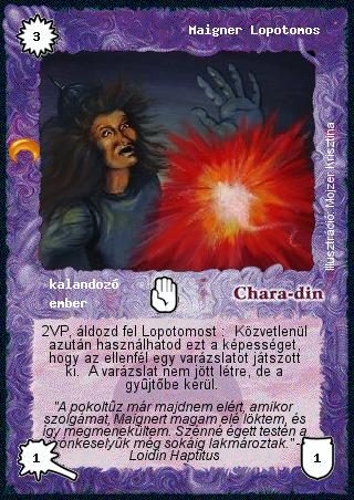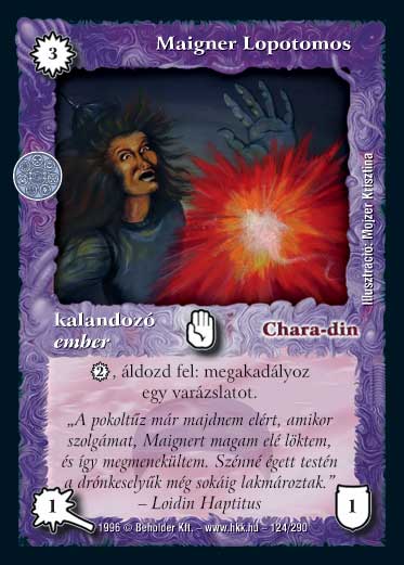 Kiadás: Chara-din visszatér, Túlélők Földje Gyakoriság: nem gyakori Lapszín (isten): Chara-din Típus: kalandozó Altípus: ember Szöveg: 2VP, áldozd fel Lopotomost: Közvetlenül azután használhatod ezt a képességet, hogy az ellenfél egy varázslatot játszott ki. A varázslat nem jött létre, de a gyűjtőbe kerül. Szinesítő szöveg: "A pokoltűz már majdnem elért, amikor szolgámat, Maignert magam elé löktem, és így megmenekültem. Szénné égett testén a drónkeselyűk még sokáig lakmároztak." - Loidin Haptitus Illusztráció: Mojzer Krisztina