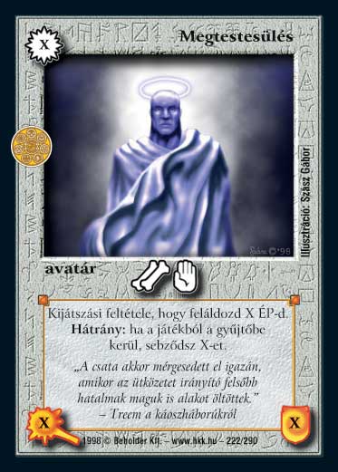 Szöveg: Kijátszási feltétele, hogy feláldozd X ÉP-d. Ha a Megtestesülés a játékból a gyűjtőbe kerül, sebződsz X ÉP-t.