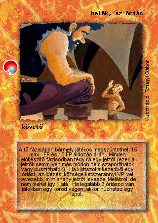 Szöveg: A fő fázisában bármely játékos megszüntetheti 15 max. ÉP és 15 ÉP áldozás árán. Minden előkészítő fázisodban tégy rá egy jelzőt (ezek a jelzők semmilyen más módon nem szaporíthatók vagy pusztíthatók). Ha kijátszol a kezedből egy óriást, az idézési költsége kétszerannyi VP-vel kevesebb, mint ahány jelzőt leveszel Melákról, de nem mehet így 1 alá. Ha legalább 3 óriásod van játékban egy köröd végén, akkor húzhatsz egy lapot.