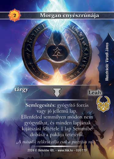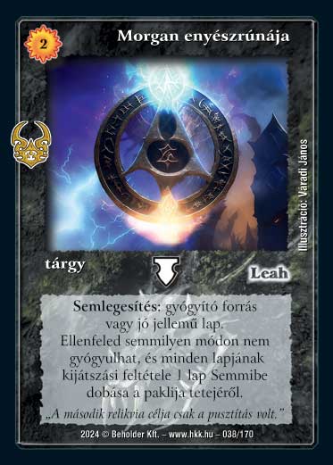 Szöveg: Semlegesítés: gyógyító forrás,vagy jó jellemű lap. Ellenfeled semmilyen módon nem gyógyulhat, és minden lapjának kijátszási feltétele 1 lap Semmibe dobása a paklija tetejéről.