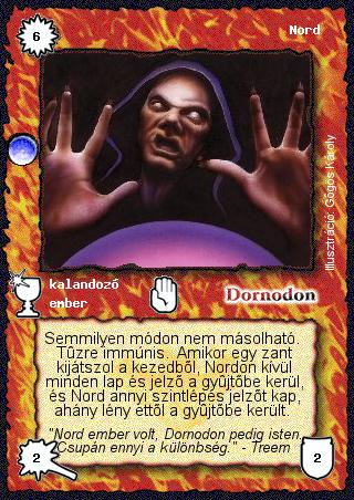 Kiadás: Árnyékhold, Védnök 2023, Túlélők Földje Gyakoriság: ritka Lapszín (isten): Dornodon Típus: kalandozó Altípus: ember Szöveg: Semmilyen módon nem másolható. Tűzre immúnis. Amikor egy zant kijátszol a kezedből, Nordon kívül minden lap és jelző a gyűjtőbe kerül, és Nord annyi szintlépés jelzőt kap, ahány lény ettől a gyűjtőbe került. Szinesítő szöveg: "Nord ember volt, Dornodon pedig isten. Csupán ennyi a különbség." - Treem Illusztráció: Gőgös Károly