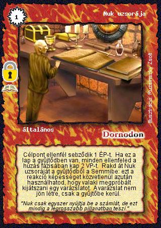 Szöveg: Célpont ellenfél sebződik 1 ÉP-t. Ha ez a lap a gyűjtődben van, minden ellenfeled a húzás fázisában kap 2 VP-t. Rakd át Nuk uzsoráját a gyűjtődből a Semmibe: ezt a reakció képességet közvetlenül azután használhatod, hogy valaki megpróbált kijátszani egy varázslatot. A varázslat nem jön létre, csak a gyűjtőbe kerül.
