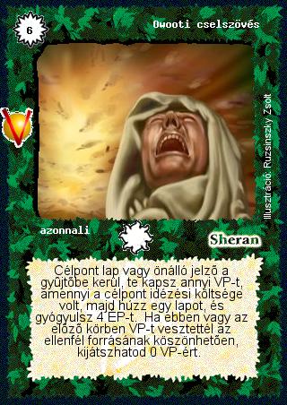 Szöveg: Célpont lap vagy önálló jelző a gyűjtőbe kerül, te kapsz annyi VP-t, amennyi a célpont idézési költsége volt, majd húzz egy lapot, és gyógyulsz 4 ÉP-t. Ha ebben vagy az előző körben VP-t vesztettél az ellenfél forrásának köszönhetően, kijátszhatod 0 VP-ért.