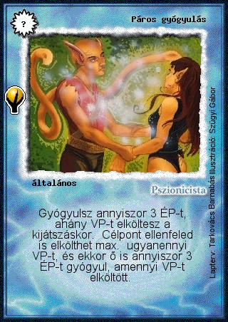 Szöveg: Gyógyulsz annyiszor 3 ÉP-t, ahány VP-t elköltesz a kijátszáskor. Célpont ellenfeled is elkölthet max. ugyanennyi VP-t, és ekkor ő is annyiszor 3 ÉP-t gyógyul, amennyi VP-t elköltött.