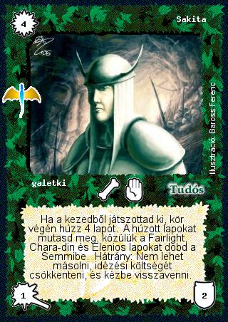 Szöveg: Ha a kezedből játszottad ki, kör végén húzz 4 lapot. A húzott lapokat mutasd meg, közülük a Fairlight, Chara-din és Elenios lapokat dobd a Semmibe. Hátrány: Nem lehet másolni, idézési költségét csökkenteni, és kézbe visszavenni.