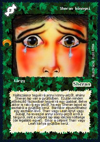 Szöveg: Kijátszáskor tegyél rá annyi könny-jelzőt, ahány Sheran lap van a gyűjtődben. Ezután minden előkészítő fázisodban tegyél rá egy újabbat, illetve akkor is rakj rá egy jelzőt, ha egy Sheran lapod az asztalról a gyűjtőbe kerül. Bármikor elpusztíthatsz egy asztalon lévő, Tharr vagy Leah lényt vagy bűbájt, ha leveszel annyi könny-jelzőt erről a tárgyról, mint a célpont lap alap idézési költsége (de legalább egyet). Ekkor a célpont Tharr vagy Leah kártya gyűjtőbe kerül.