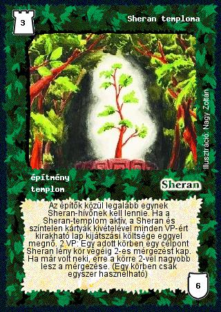 Szöveg: Az építők közül legalább egynek Sheran-hívőnek kell lennie. Ha a Sheran-templom aktív, a Sheran és színtelen kártyák kivételével minden VP-ért kirakható lap kijátszási költsége eggyel megnő. 2 VP: Egy adott körben egy célpont Sheran lény kör végéig 2-es mérgezést kap. Ha már volt neki, erre a körre 2-vel nagyobb lesz a mérgezése. (Egy körben csak egyszer hasznélható)