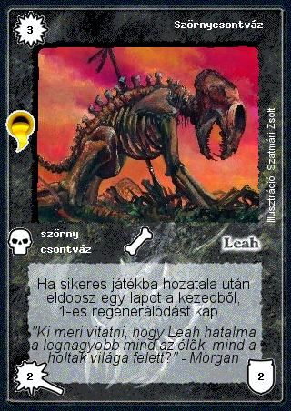| (AK47) A Szörnycsontváz akkor is rendelkezik speciális képességgel, ha a kijátszásakor nem dobok lapot. Azokat a szövegeket, amik a lény lapokra vannak írva, és nem a flavorhoz tartoznak, három csoportba lehet osztani: hátrány, kijátszási feltétel, speciális képesség. A Szörnycsontváznál ez ugye nem hátrány, nem is kijátszási feltétel, mivel lapdobás nélkül is ki lehet játszani, marad tehát a speciális képesség, akárcsak a Helvirnél. |