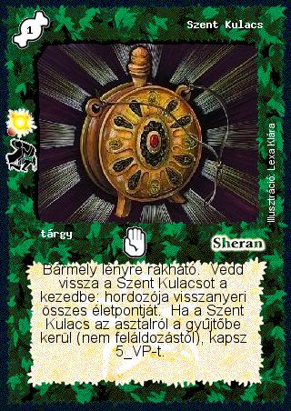 Szöveg: Bármely lényre rakható. Vedd vissza a Szent Kulacsot a kezedbe: hordozója visszanyeri összes életpontját. Ha a Szent Kulacs az asztalról a gyűjtőbe kerül (nem feláldozástól), kapsz 5 VP-t.