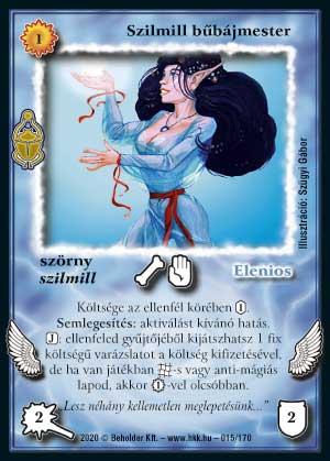 Kiadás: Homokdűnék Gyakoriság: ritka Lapszín (isten): Elenios Típus: szörny Altípus: szilmill Szöveg: Költsége az ellenfél körében [1]. Semlegesítés: aktiválást kívánó hatás. (J): ellenfeled gyűjtőjéből kijátszhatsz 1 fix költségű varázslatot a költség kifizetésével, de ha van játékban _háló-s vagy anti-mágiás lapod, akkor 1_VP-vel olcsóbban. Szinesítő szöveg: "Lesz néhány kellemetlen meglepetésünk..." Illusztráció: