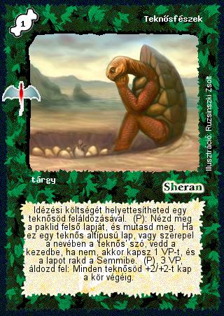 Szöveg: Idézési költségét helyettesítheted egy teknősöd feláldozásával. (P): Nézd meg a paklid felső lapját, és mutasd meg. Ha ez egy teknős altípusú lap, vagy szerepel a nevében a 'teknős' szó, vedd a kezedbe, ha nem, akkor kapsz 1 VP-t, és a lapot rakd a Semmibe. (P), 3 VP, áldozd fel: Minden teknősöd +2/+2-t kap a kör végéig.