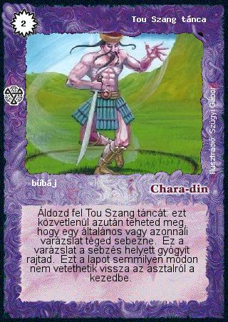 Szöveg: Áldozd fel Tou Szang táncát: ezt közvetlenül azután teheted meg, hogy egy általános vagy azonnali varázslat téged sebezne. Ez a varázslat a sebzés helyett gyógyít rajtad. Ezt a lapot semmilyen módon nem vetethetik vissza az asztalról a kezedbe.