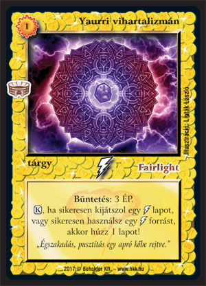 | Van játékban 2 Yaurri vihartalizmán. Az egyiket leszedik, és kisül a Büntetése. Kisül a másik talizmánnak a képessége amiatt, hogy villámsebzést használtam. A büntetés ugyan automatikus hatás, de szövegben a „használ” ige önmagában nem definiálja az aktivizálást igénylő hatásokat, ahogy azt a Zilak-din főkancellárnál is leírtuk. Ha csak ilyenekre működne, akkor az külön rá lenne írva, ld. pl. A sors fintora (új). |