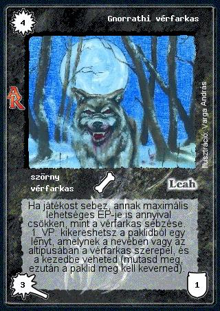 Kiadás: Alanori Krónika Gyakoriság: ritka Lapszín (isten): Leah Típus: szörny Altípus: vérfarkas Szöveg: Ha játékost sebez, annak maximális lehetséges ÉP-je is annyival csökken, mint a vérfarkas sebzése. 1 VP: kikereshetsz a paklidból egy lényt, amelynek a nevében vagy az altípusában a vérfarkas szerepel, és a kezedbe veheted (mutasd meg, ezután a paklid meg kell keverned). Illusztráció: Varga András