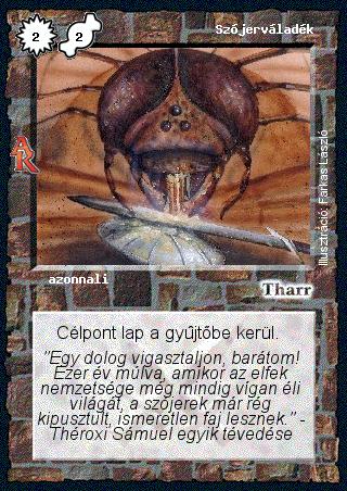 Szinesítő szöveg: "Egy dolog vigasztaljon, barátom! Ezer év múlva, amikor az elfek nemzetsége még mindig vígan éli világát, a szójerek már rég kipusztult, ismeretlen faj lesznek." - Théroxi Sámuel egyik tévedése