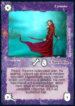 Kiadás: Alanori Krónika Gyakoriság: ritka Lapszín (isten): Chara-din Típus: szörny Szöveg: Repül. Sikeres kijátszása után, ha akarod, célpont lap elveszíti minden speciális képességét, vagy célpont önálló jelző kikerül a játékból. Ha nem használod ezt a képességet, akkor nem lehet azonnali és bűbáj varázslat célpontja, és 3-as büntetést kap. Illusztráció: Varga András