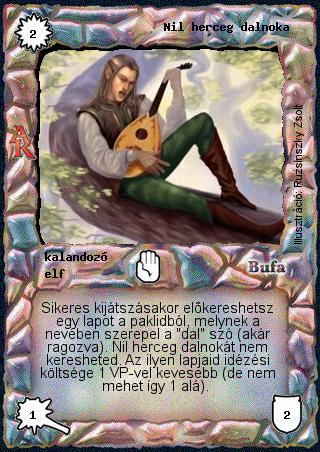Szöveg: Sikeres kijátszásakor előkereshetsz egy lapot a paklidból, melynek a nevében szerepel a "dal" szó (akár ragozva). Nil herceg dalnokát nem keresheted. Az ilyen lapjaid idézési költsége 1 VP-vel kevesebb (de nem mehet így 1 alá).