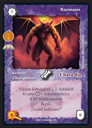 Bazmaon (8): Végre kiteljesedett a thargodan pakli. A tengermélyes lapokkal már majdnem ütőképes koncepciót alkottak, de eddig hiányzott az igazi erő. Némi olcsóbbítás mellett akár ingyen is lehozhatjuk. (Na jó, 8 ÉP áldozása azért nem éppen ingyenes, de legalábbis VP költség nélküli.) Sajnos csak a második körtől kezdve, pedig thargodanoknál nem lenne lehetetlen első körben olcsóbbítani. Amúgy igazi agyatlan ütőlény, még a Zu'lit sárkányánál is egyszerűbb. Kyorgos pakliba is ki lehet próbálni, a counterelhetetlensége nehezen megoldhatóvá teszi, és még "r" betű sincs a nevében. Ha nem nagyon gyors pakliba használjuk, érdemes mellé alapból valami hatékony gyógyulást használni (pl. Visszavágás), nehogy bajba kerüljünk.