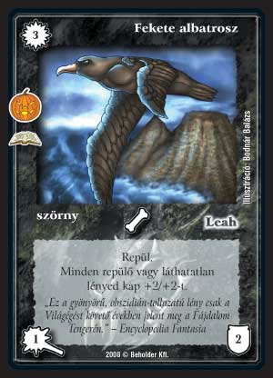Fekete albatrosz (7): Ha sok repülő lénnyel játszunk - ami nem annyira nagy művészet; hiszen a legtöbb értelmes lény repül -, akkor jól jöhet melléjük a Fekete albatrosz. Önmagában sajnos kissé gyönge, egy Hullámsárkány is táposabb nála, ha már egy lényt erősít, akkor korrektnek számít. Ha már két-három lényt is erősít, akkor elég jól jártunk.