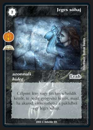 Jeges sóhaj (6): Ennek a lapnak igazán a frissen bontott versenyen lett volna értelme, bármiféle koncepcióba túl gyenge. Kettőt lőni kettőért sokszor haszontalan, a keresgéléssel már van egy kis értelme, de szerintem túl költséges, illetve ahogy fogynak a pakliból, úgy gyengül a lap (ráadásul a nekronozás is bajt okozhat). Szerintem egy Sziklarepesz sokkal jobb nála, pedig az se valami nagy lap.