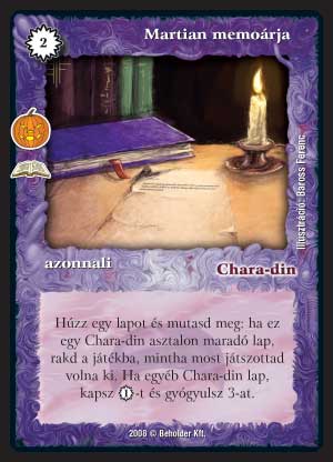 Martian memoárja (8): A kedvenc lapom a kiegészítőből. Egyértelműen látszik, hogy miféle pakliban kell használni: egy egyszínű, vagy majdnem egyszínű Chara-din pakliban. E mellett még a Szépia is igen jó érv arra, hogy kipróbáljunk egy tisztán Chara-din paklit akár olyan környezetben is, ahol több szín használata is megengedett. A lap működése kissé lutri, sosem tudhatjuk, hogy mit hoz a jövő. Szerencsére pont lila a Kifordított varázsdoboz is, így mindig jó időben tudjuk elsütni a memoárt. Jelenleg szerintem Kyorggal lehet összerakni a leghatékonyabb lila paklit.