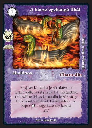 Chara-din bűbája (9): Mi tagadás, kissé fantázia szegény kártya - de emiatt ne búsuljunk, bőségesen megéri használni. Pár napja megjelent cikkemben (Chara- din hatalmas) éppen az egyszínű lila koncepciókban rejlő lehetőségeket boncolgattam, erre derült égből villámcsapásként megjelenik még egy "lila zén". Nos nem lesz nagy ördöngösség beilleszteni Chara-din bűbáját, számolatlan lehetőség bujkál benne. Bár maga a lap egyedi képessége (dobat egyet) nem annyira erőteljes, mint mondjuk a Tharr bűbájának a laphúzása, egyvalami mégis kiegyensúlyozottá teszi: remekül összejátszik az anti-mágiájával. Ez leginkább a sok counteres paklikat fogja akadályozni, melyek nem leszednek, hanem counterelnek. Reszkessetek kontrollok, Chara-din le fog csapni rátok!
