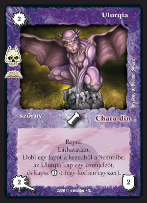 Ulurqia (7): Amolyan Óriás denevérszerű fajzat. Lejön, s minden körben egyre nagyobbá válik. Igaz, ehhez dobálni kell neki a lapokat - no de annyi baj legyen, majd visszahúzzuk izomként, s addig is kapunk egy manát. Ami koránt sem elhanyagolható, hogy az ellenfél körében is lehet erősíteni, így kemény ellenfele lesz a lényeknek. Láthatatlansága miatt az ellenfél sosem lesz biztonságban.