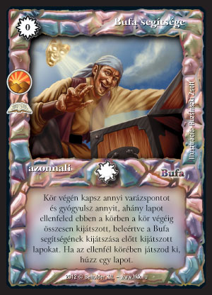 Bufa segítsége (8): A manapság divatos terülős paklik miatt igen hasznos lehet egy lap, ami segít nekünk tartani a tempót. Egy szépen meginduló, pörgős pakli ellen igen zsíros bevételre számíthatunk - de kérdés, hogy mikor játsszuk ki? Ha rögtön az első lap után, akkor az ellenfél lehet egy sima passzal reagál, és nem aknáztuk ki a benne rejlő lehetőségeket maximálisan. De ha hagyjuk terülni, akkor kidobathatják, vagy egy Tirranda batyuval semlegesíthetik. Szerintem egy lap után is simán jó már kijátszani, egy ingyen mana is jó a játék elején. Ha meg tovább pörög az ellenfél, akkor tele leszünk VP-vel, ha meg nem, akkor meg ingyen véget vetettünk a körének. Egy baj van csak a lappal, hogy a saját körben nem lehet lecserélni egy másik lapra, így a játék későbbi szakaszában már nagyon gyenge is lehet.