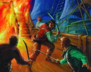 Kalózok próbálják elfoglalni a hajót a Kétélű fegyver című könyv borítóján.