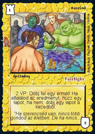 Kiadás: Alanori Krónika Gyakoriság: ritka Lapszín (isten): Fairlight Típus: építmény Szöveg: 2 VP: Dobj fel egy érmét! Ha eltalálod az eredményt, húzz egy lapot, ha nem, dobj egy lapot a kezedből. Szinesítő szöveg: "Ha szerencséd van, nincs több gondod az életben. De ha nincs..." Illusztráció: Fischer Tamás, Nagy Viktória