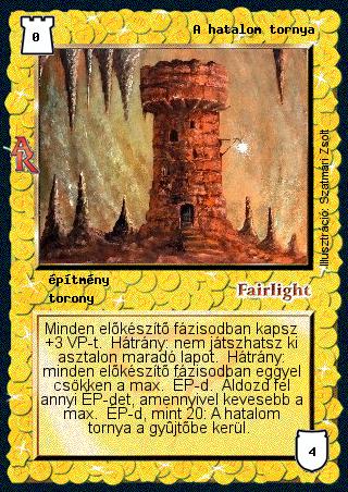 Kiadás: Alanori Krónika Gyakoriság: ritka Lapszín (isten): Fairlight Típus: építmény Altípus: torony Szöveg: Minden előkészítő fázisodban kapsz +3 VP-t. Hátrány: nem játszhatsz ki asztalon maradó lapot. Hátrány: minden előkészítő fázisodban eggyel csökken a max. ÉP-d. Áldozd fel annyi ÉP-det, amennyivel kevesebb a max. ÉP-d, mint 20: A hatalom tornya a gyűjtőbe kerül. Illusztráció: Szatmári Zsolt