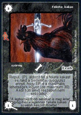 Kiadás: Alanori Krónika Gyakoriság: ritka Lapszín (isten): Leah Típus: szörny Szöveg: Repül. (P), áldozd fel a fekete kakast és rakd a Semmibe: gyógyulsz annyit, hogy ÉP-d a maximális lehetséges legyen (de maximum 30). A kör hátralevő részében nem sebződsz. Szinesítő szöveg: "A legborzasztóbb sebeket is meg lehet gyógyítani a legendás Fekete kakas szívéből készült főzettel." Illusztráció: Farkas László Tervező: Pusztai Dániel