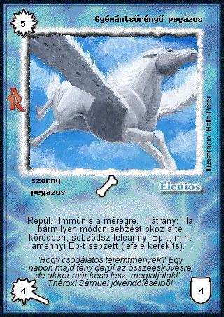 Kiadás: Alanori Krónika Gyakoriság: ritka Lapszín (isten): Elenios Típus: szörny Altípus: pegazus Szöveg: Repül. Immúnis a méregre. Hátrány: Ha bármilyen módon sebzést okoz a te körödben, sebződsz feleannyi Ép-t, mint amennyi Ép-t sebzett (lefelé kerekíts). Szinesítő szöveg: "Hogy csodálatos teremtmények? Egy napon majd fény derül az összeesküvésre, de akkor már késő lesz, meglátjátok!" - Théroxi Sámuel jövendöléseiből Illusztráció: Balla Péter
