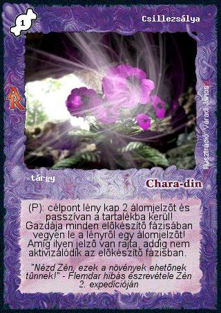 Kiadás: Alanori Krónika Gyakoriság: ritka Lapszín (isten): Chara-din Típus: tárgy Szöveg: (P): célpont lény kap 2 álomjelzőt és passzívan a tartalékba kerül! Gazdája minden előkészítő fázisában vegyen le a lényről egy álomjelzőt! Amíg ilyen jelző van rajta, addig nem aktivizálódik az előkészítő fázisban. Szinesítő szöveg: "Nézd Zén, ezek a növények ehetőnek tűnnek!" - Flemdar hibás észrevétele Zén 2. expedícióján Illusztráció: Váradi János