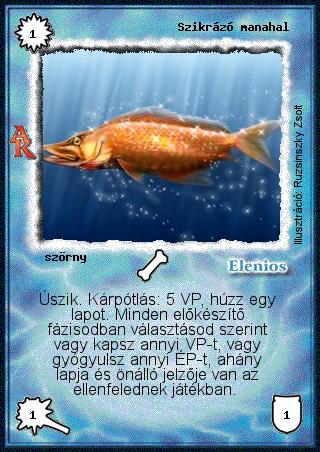 Kiadás: Alanori Krónika Gyakoriság: ritka Lapszín (isten): Elenios Típus: szörny Szöveg: Úszik. Kárpótlás: 5 VP, húzz egy lapot. Minden előkészítő fázisodban választásod szerint vagy kapsz annyi VP-t, vagy gyógyulsz annyi ÉP-t, ahány lapja és önálló jelzője van az ellenfelednek játékban. Illusztráció: Ruzsinszki Zsolt