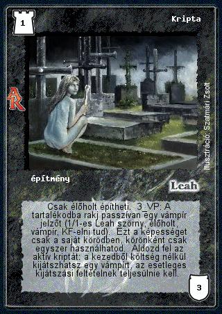 Kiadás: Alanori Krónika Gyakoriság: ritka Lapszín (isten): Leah Típus: építmény Szöveg: Csak élőholt építheti. 3 VP: A tartalékodba rakj passzívan egy vámpír jelzőt (1/1-es Leah szörny, élőholt, vámpír, KF-elni tud). Ezt a képességet csak a saját körödben, körönként csak egyszer használhatod. Áldozd fel az aktív kriptát: a kezedből költség nélkül kijátszhatsz egy vámpírt, az esetleges kijátszási feltételnek teljesülnie kell. Illusztráció: Szatmári Zsolt