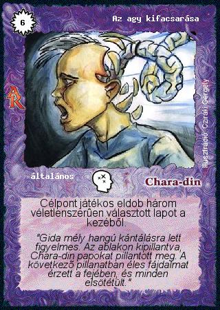 Kiadás: Alanori Krónika Gyakoriság: ritka Lapszín (isten): Chara-din Típus: általános Szöveg: Célpont játékos eldob három véletlenszerűen választott lapot a kezéből. Szinesítő szöveg: "Gida mély hangú kántálásra lett figyelmes. Az ablakon kipillantva, Chara-din papokat pillantott meg. A következő pillanatban éles fájdalmat érzett a fejében, és minden elsötétült." Illusztráció: Cziráki Gergely