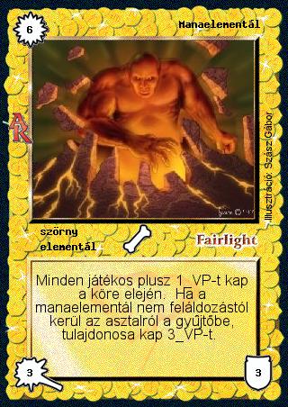 Kiadás: Alanori Krónika Gyakoriság: ritka Lapszín (isten): Fairlight Típus: szörny Altípus: elementál Szöveg: Minden játékos plusz 1 VP-t kap a köre elején. Ha a manaelementál nem feláldozástól kerül az asztalról a gyűjtőbe, tulajdonosa kap 3 VP-t. Illusztráció: Szász Gábor